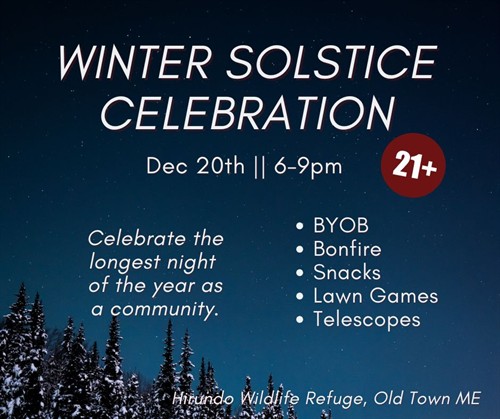 Embrace the magic of the Winter Solstice with us at Hirundo Wildlife Refuge on Saturday December 21st, from 6-9pm for an evening of connection, reflection, and celebration. Gather around the bonfire, enjoy seasonal snacks & drinks, BYOB, learn about the solstice, what it is and what it means for the natural world, and spend time with friends - old and new.