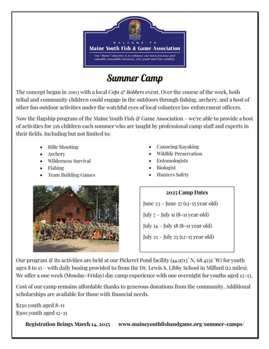 The Maine Youth Fish and Game Association was established for the purpose of promoting the love and respect for the Maine outdoors by the youth of Maine and extending to these youth, the treasures of experience in the outdoors.